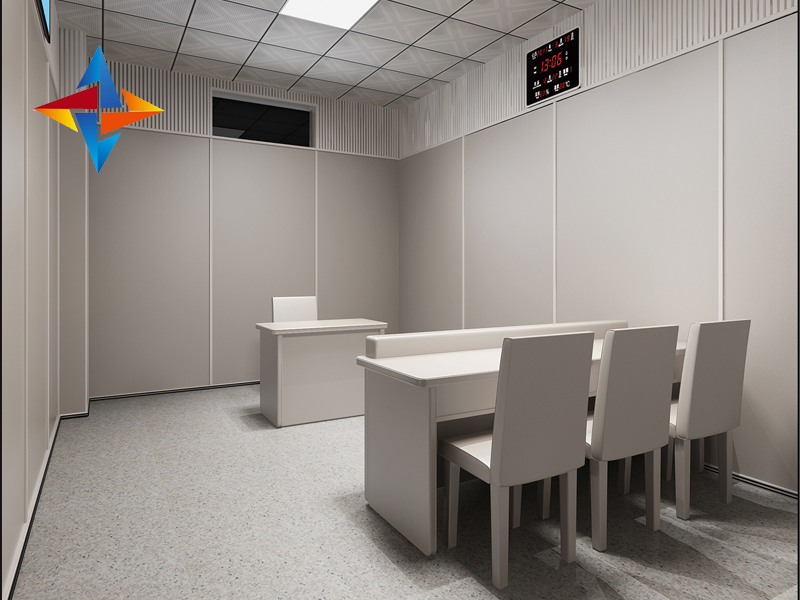 審訊室布局考慮到訊問的嚴(yán)肅性和成像效果,訊問室內(nèi)的布置和顏色,以及審訊桌椅的色調(diào)必須烘托主題,營(yíng)造審訊的氛圍。派出所、檢察院等辦案區(qū)訊問室的墻面有嚴(yán)格要求,墻面材料需要兼具環(huán)保、防撞、阻燃特性,與傳統(tǒng)的聲學(xué)材料相比,新型材料更加具備以上的能力,能大大提高審訊安全性。從訊問室的威嚴(yán)性和攝像機(jī)拍取視頻圖像的角度說,訊問室整體裝修色調(diào)不要太花哨,不易進(jìn)行過多的擺設(shè)。