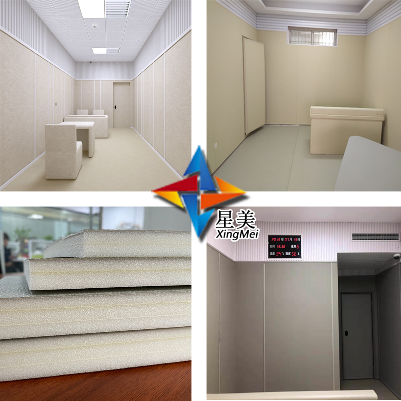 談話室防撞軟包采用的是聚乙烯納米防撞棉與皮革無膠復(fù)合而成。具備防撞、防火防水、環(huán)保、無氣味、零甲醛、吸音等功能,完全滿足現(xiàn)在新的辦案區(qū)安全建設(shè)標(biāo)準(zhǔn)要求,防止犯罪嫌疑人自殘自殺,談話審訊過程安全標(biāo)準(zhǔn)化,提高辦案效力。 廣州星美建材有限公司。