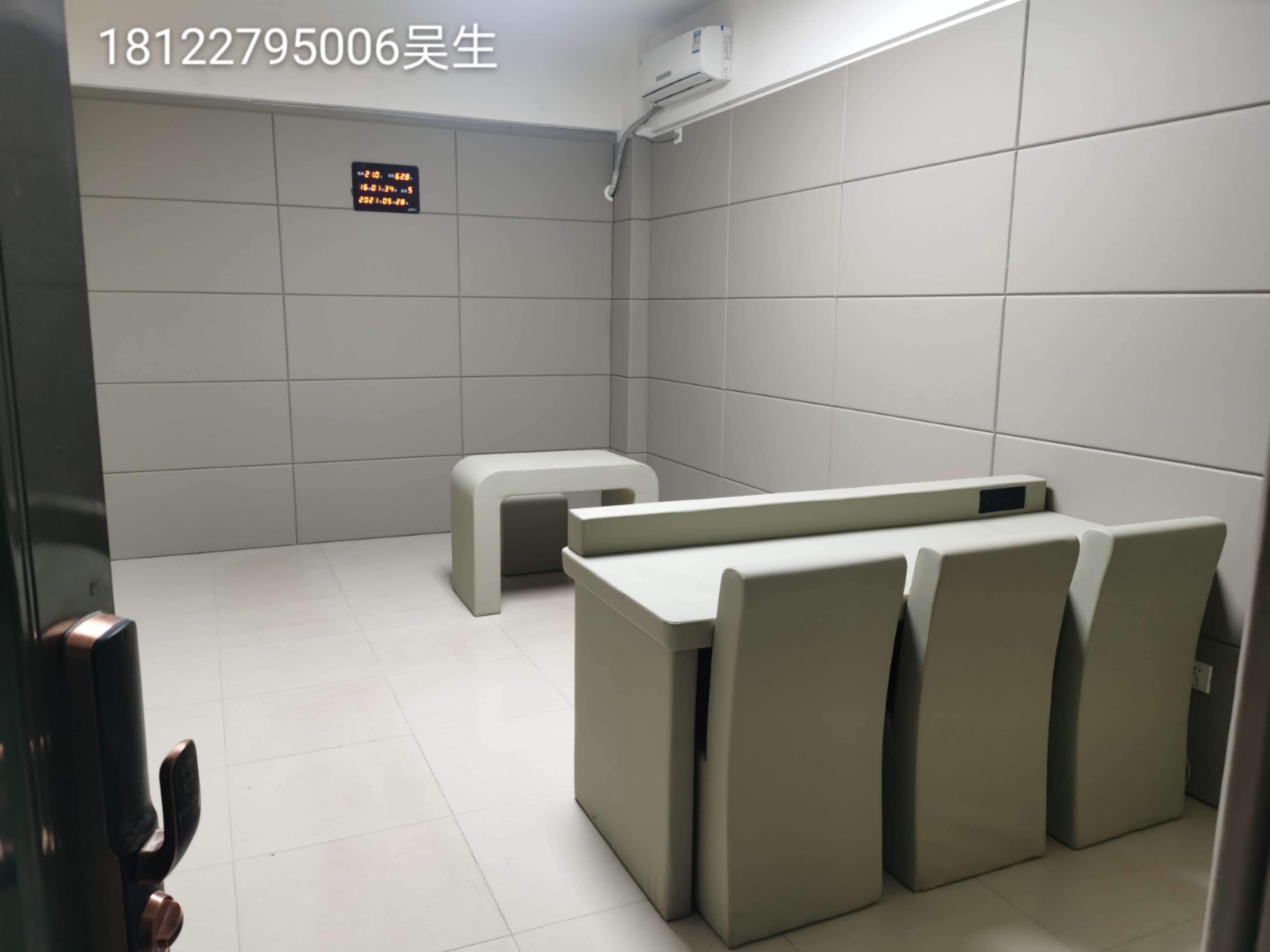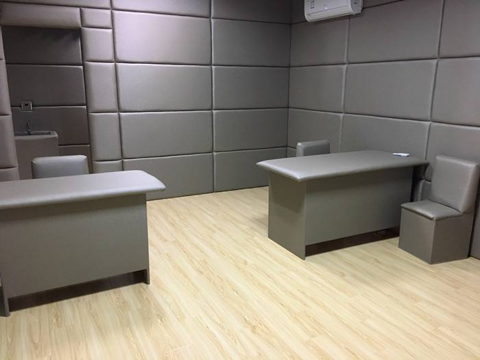 3.施工后,查看軟包墻板邊緣是否有縫隙,如縫隙較大可補(bǔ)膠處理,留置室四周陰陽角施工在軟包背面基材開直角槽,小木條加F30射釘固定墻板,待拆下無脫落現(xiàn)象即可用硅膠中線條封邊。